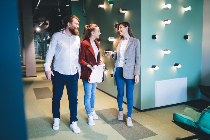 В первую очередь надо учитывать островной характер мест для групп сотрудников. Для их освещения в современном офисе существует ряд светильников прямого/отраженного света, специально разработанные специально для работы у экрана монитора. Наряду с освещением рабочих зон настоит забывать о коммуникационных и периферийных зонах. Разнообразное освещение первых структурирует пространство и облегчает ориентацию. Светлые периферийные зоны, например, белые стены освещенные настенными светильниками заливающего света, зрительно увеличиваю помещение.