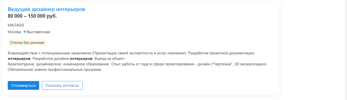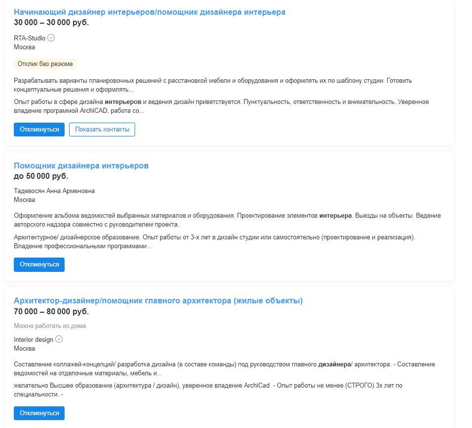 В требованиях вакансии, как правило, фигурирует: образование в сфере дизайна и архитектуры, владение ArchiCAD, AutoCAD и другими профессиональными компьютерными программами, хороший уровень насмотренности, готовность вести сразу 3-4 проекта.